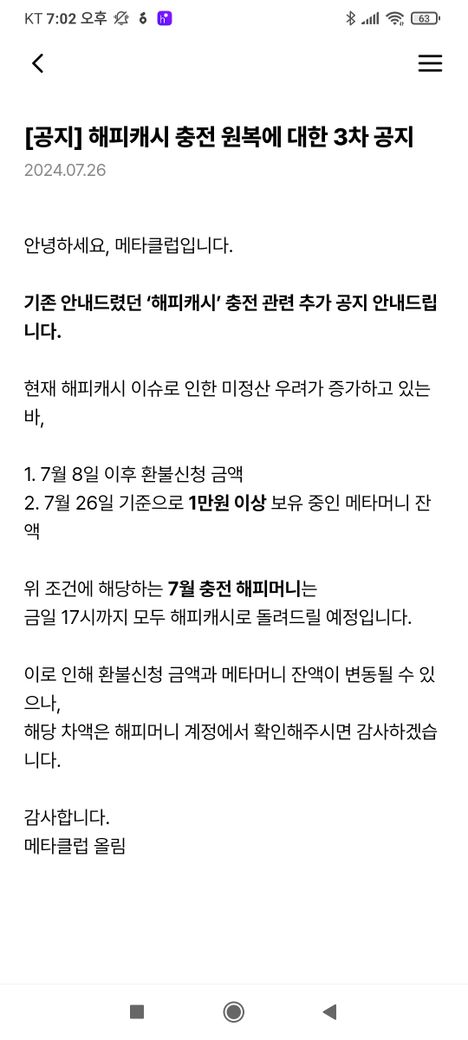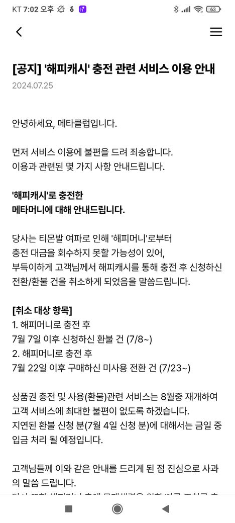 원복 조건은 1. 해피캐시로 충전 후 7월 7일 이후 신청하신 환불 건 (7/8~) 2. 해피캐시로 충전 후 7월 22일 이후 구매하신 미사용 전환 건(7.23~)