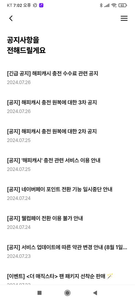 아침에 보니 공지로 웰컴페이 전환이 막혔다는 공지가 올라왔고 오전에 해피머니에서 메타머니로 충전한