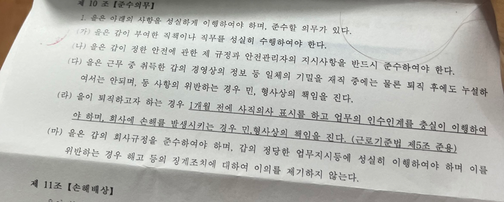 되도록 퇴사통보기간은 준수하는게 맞지만 1개월 전 회사의 승인없이 무단퇴사를 하여 사업장에 손해가 발생한 경우 민사상