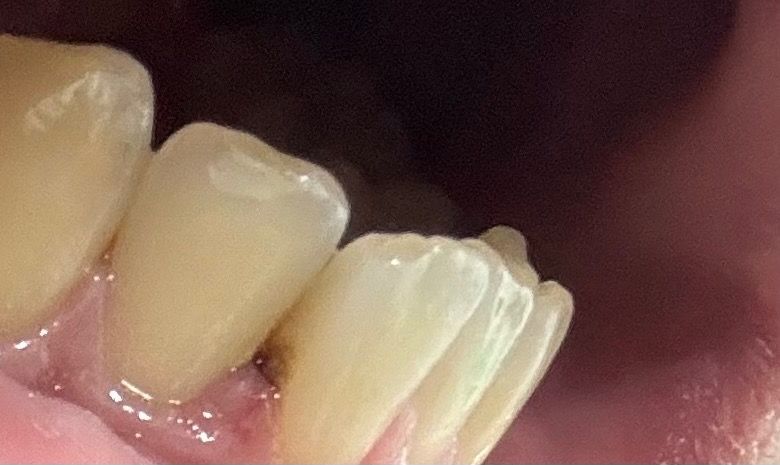 치근우식(치아 뿌리에 가까운 충치)이거나 아니면 치석 낀 것 같습니다. 일단 스케일링해서 주변 깨끗이 한다음에 충치 재평가 해보면 될 것 같습니다.