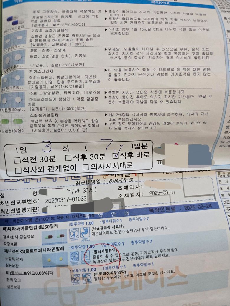 산부인과 피부과약에서 항생제와 항히스타민제가 중복되기에 우선은 산부인과 약을다 복용을 먼저하고 피부과약을 이어서 복용을 하는 것을 권장드립니다.