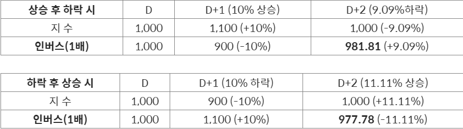 사람들이 인버스를 사서 횡보하게 되면 계좌가 녹는다고 하는데 왜 그렇게 되는건가요? 본인이 샀던 금액으로 오게되면 본전이 되는개념이 아닌가요?