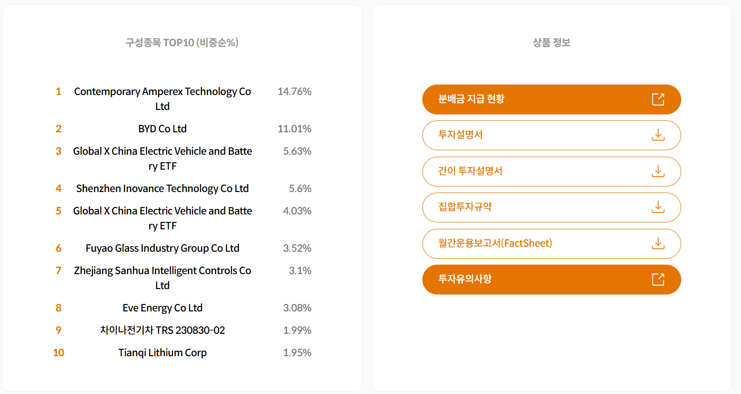 예를 들어 아래사진은 미래에셋 중국전기차 ETF인데 사이트 가면 비중 TOP10나오고 오른쪽에 월간운용보고서 다운받으면 아마 더 자세히 적혀있을것입니다.