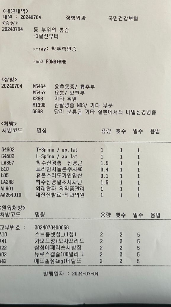 등통증이 한달전부터 굽히면있고 2,3일 전부터는 좌우로 움직이거나 아래로 굽힐때 또 숨 크게쉴때 아파서 엑스에이찍었더니 측만증 조금 있고 신경이 부어서 그런거같다고 다음 주사랑 약 처방받았습니다