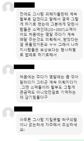- 사기꾼이 합의를 원한다면서 할부로 돈을 갚다가 대출이 가능하면 나머지 한번에 갚겠다고 얘기합니다. 대출가능한 시기는 내년 8월정도는 되어야 가능하다고 합니다.