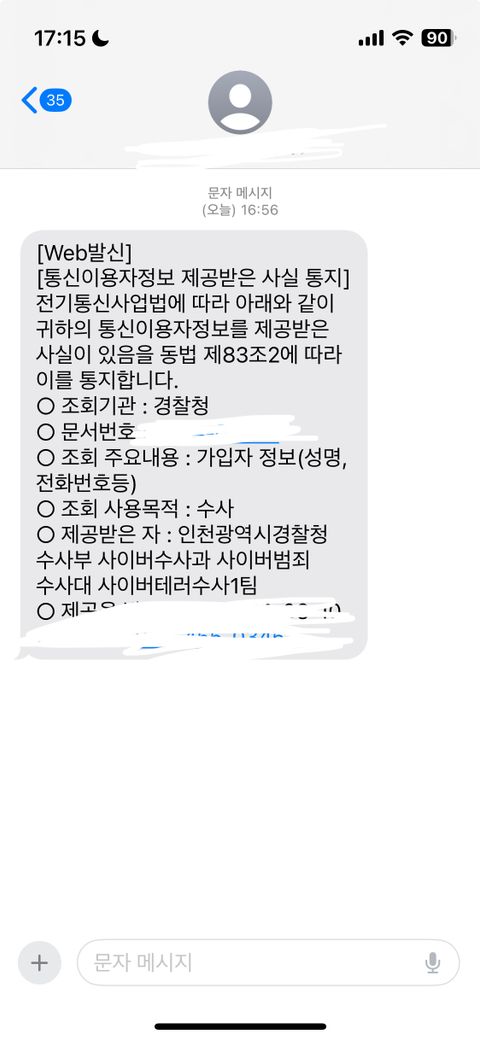 전기통신사업법 제83조2(통신이용자정보 제공을 받은 사실의 통지)에 따라 통신이용자정보 제공을 받은 검사, 수사관서의 장, 정보수사기관의 장(이하 “수사기관등”이라 한다)은 그 통신이용자정보 제공을 받은 날(제2항에 따라 통지를 유예한 경우에는 제3항에 따른 통지유예기간이 끝난 날을 말한다)부터 30일 이내에 통신이용자정보 제공의 대상이 된 당사자에게 서면 또는 문자메시지, 메신저 등 전자적 방법으로 통지하여야 합니다. 이에 따른 통지로 이런 문자를 받더라도 당황하시지 마시고, 전화로 문의해 보시고, 잘못한 것이 없다면 크게 신경 쓰지 않아도 될 것입니다.