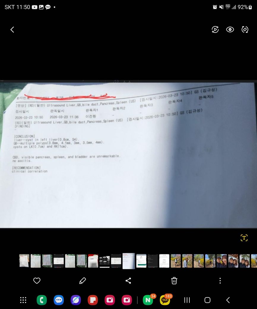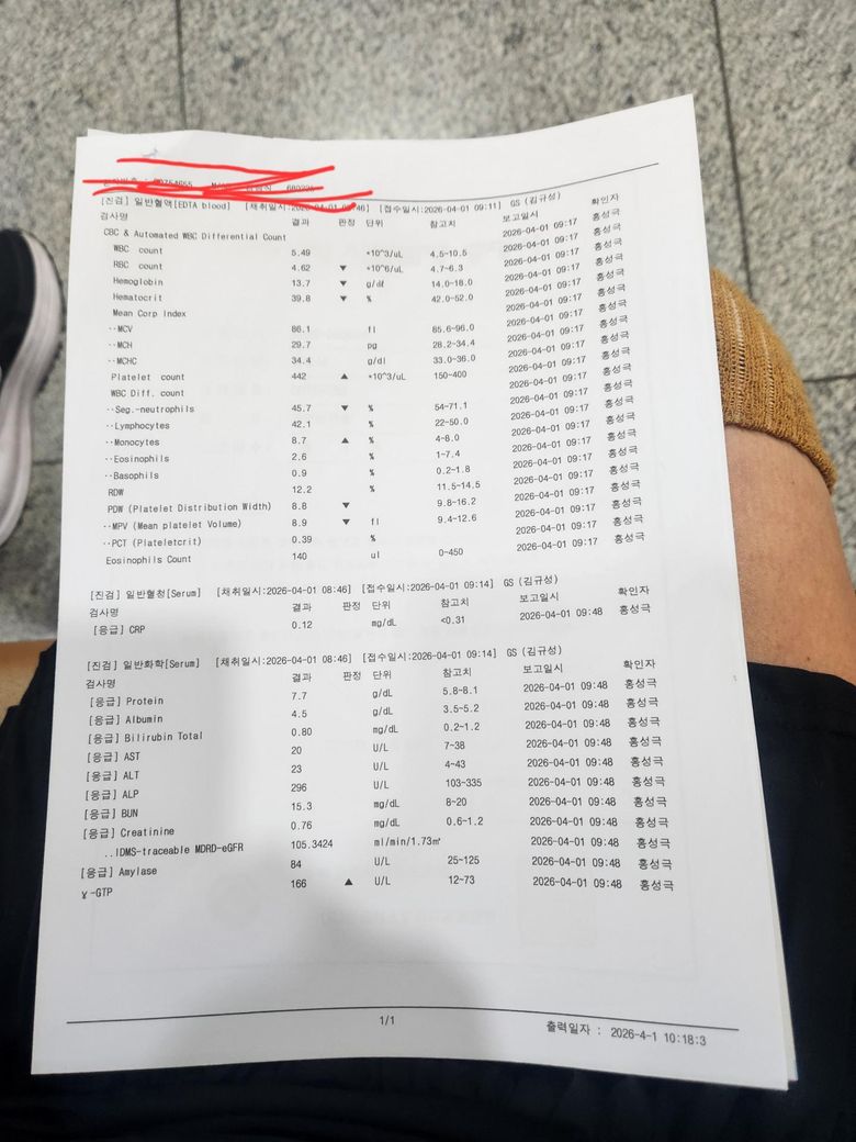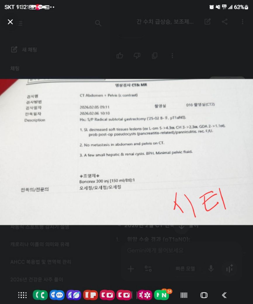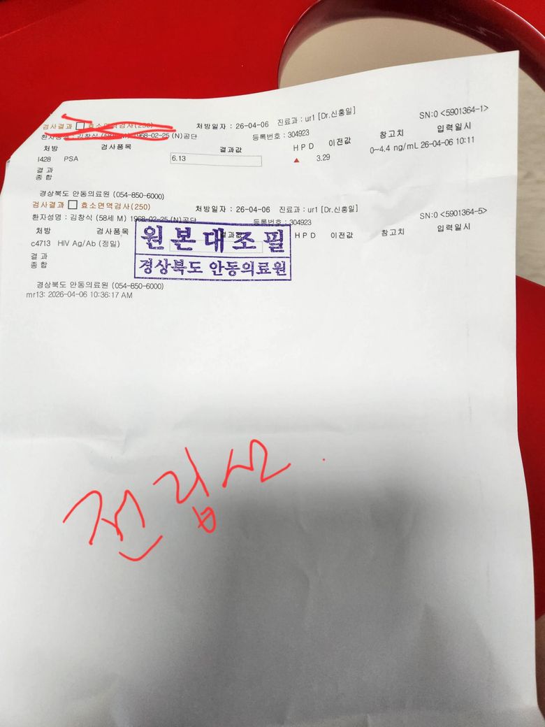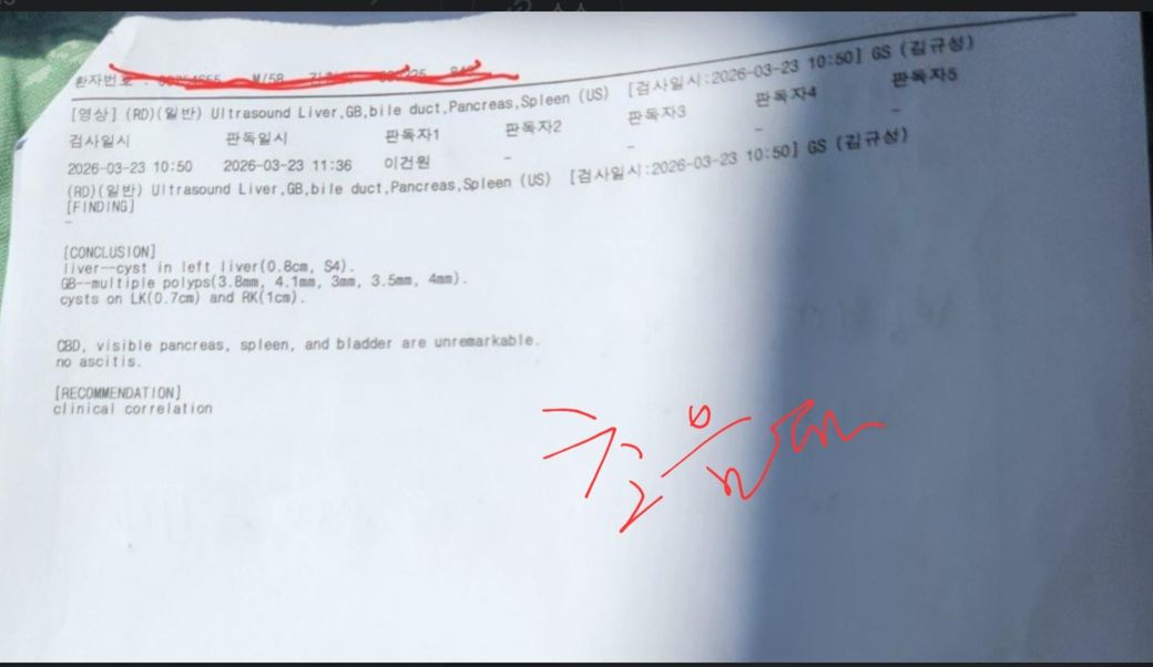 비뇨기 오시라는 외래만 잘 오시면되겠습니다. 첨부 사진 기준으로 보면, 오늘 검사에서 PSA가 6.13이고 이전값이 3.29로 보입니다. 같은 자료에서 전립선비대가 있었다는 설명이 있고, 최근 간수치 상승은 현재는 많이 회복된 상태로 보입니다. 4월 1일 검사지는 아스파르테이트아미노전달효소 20, 알라닌아미노전달효소 23, 총빌리루빈 0.80, C-반응단백 0.12로 확인되어 전신 염증이나 간기능은 당시 상당 부분 정상화된 것으로 읽힙니다. 다만 감마지티피는 아직 166으로 남아 있어 완전한 회복 과정 중일 가능성은 있습니다. 사진상 복부 초음파는 간낭종, 담낭 용종, 신장 낭종 정도이고 급성 폐쇄성 병변 소견은 뚜렷하지 않아 보입니다.