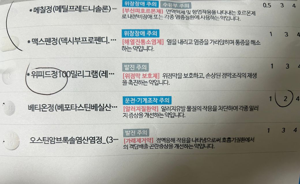 처방받은 약 메칠정, 맥스펜정, 위피드정, 베티온정, 오스틴암브록솔염산염정에도