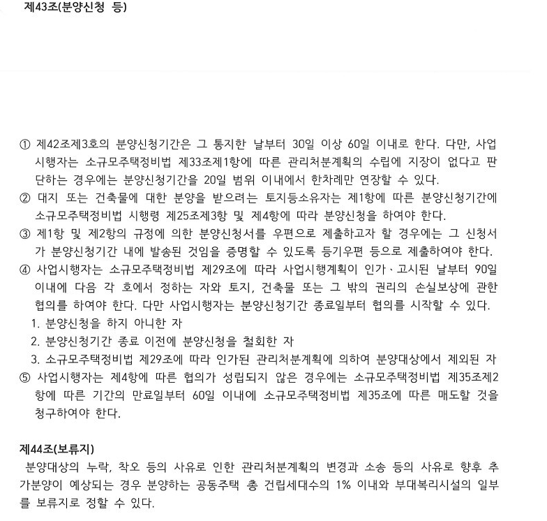 분양 신청을 하고 분양 계약을 하지 않는 경우 위 정관 내용에 정확한 기재가 없지만