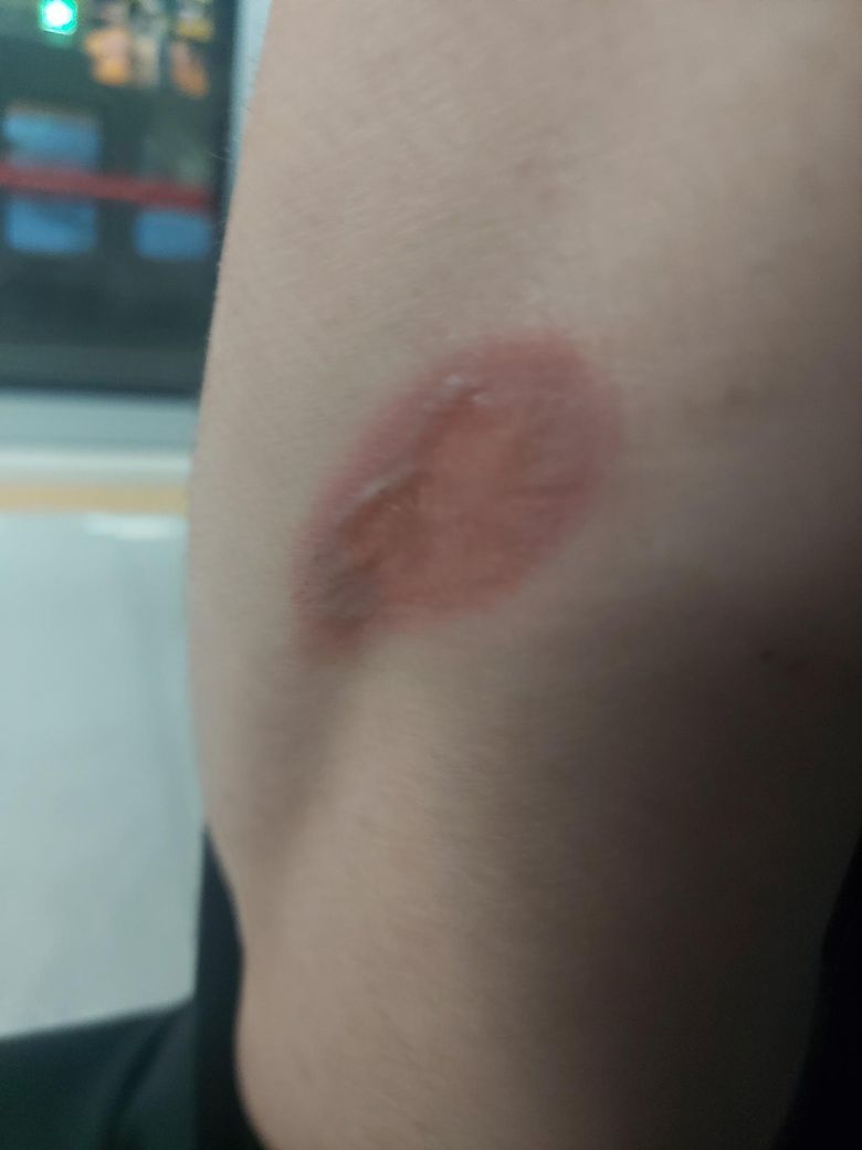 사진상 병변은 표재성 2도 화상으로 보입니다. 이미 수포를 제거한 상태라면 표피 보호막이 소실된 상태라 통증과 감염 위험이 증가한 상황입니다.
