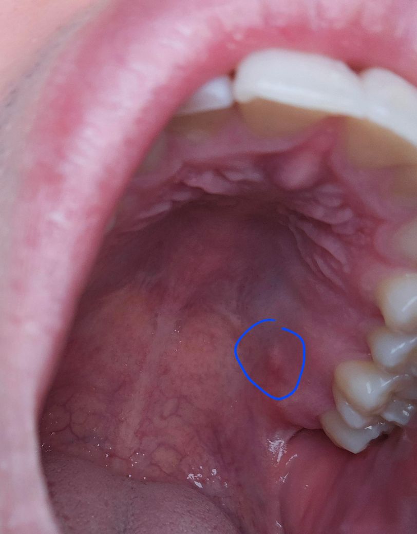 입천잔 부위에 과잉치가 있을 수도 있고 이런 경우 엑스레이를 찍어봐야 알 수 있습니다. 단순 골 융기일 수도 있습니다. 사진상으론 알 수 있는게 많지 않고 일단 치과를 가보시는 것을 추천드립니다.