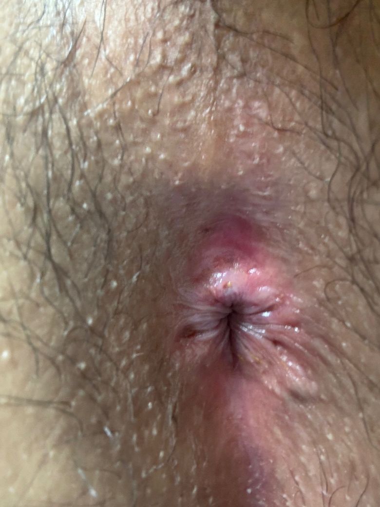 헤르페스 병변의 경우 가장 중요한 부분은 성적 접촉이 있었는지 유무입니다. 만일 최근 1개월 이내에 불특정 상대랑 성적 접촉이 있었다고 하면 헤르페스의 감염을 완전히 배제하기는 어려우나, 모양을 보았을 때 전형적인 수포성 병변은 아니며 발적이 있고 정확하지는 않으나 미세한 구멍이 있는 것으로 보아 항문주의 샛길이나 농양 등을 의심해 봐야 할 수 있겠습니다. 우선 근처 외과에 방문하셔서 항문 진찰을 다시 받아보시고 추가적인 치료 여부를 결정하시는 것이 좋겠습니다.