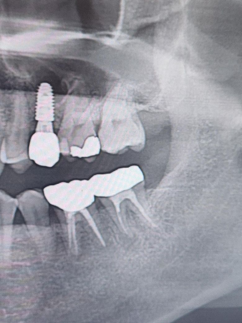 치과의사 : 신경치료 한 부분에 염증이 생겨서 지금 잇몸뼈가 녹아내리고 있다고.. 임플란트가 필요해 보이네요
