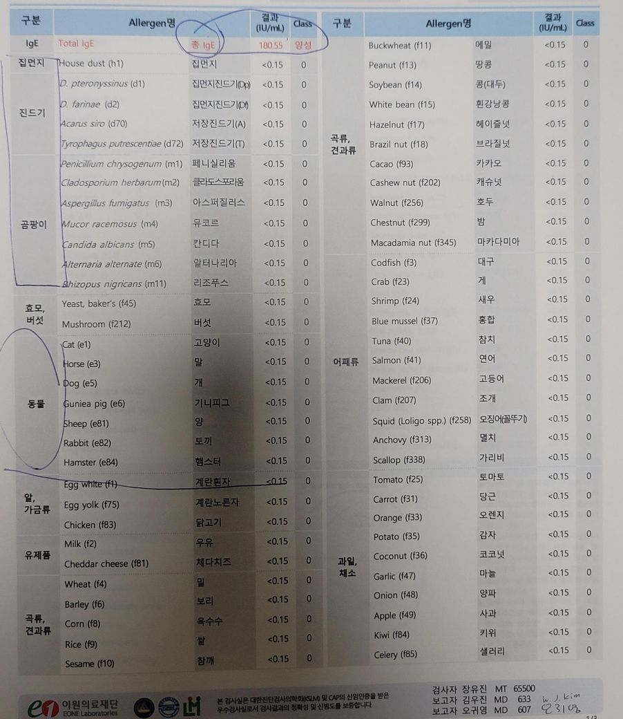 전신두드러기가 생겨서 치료받고 알레르기검사결과에 대한 질문입니다