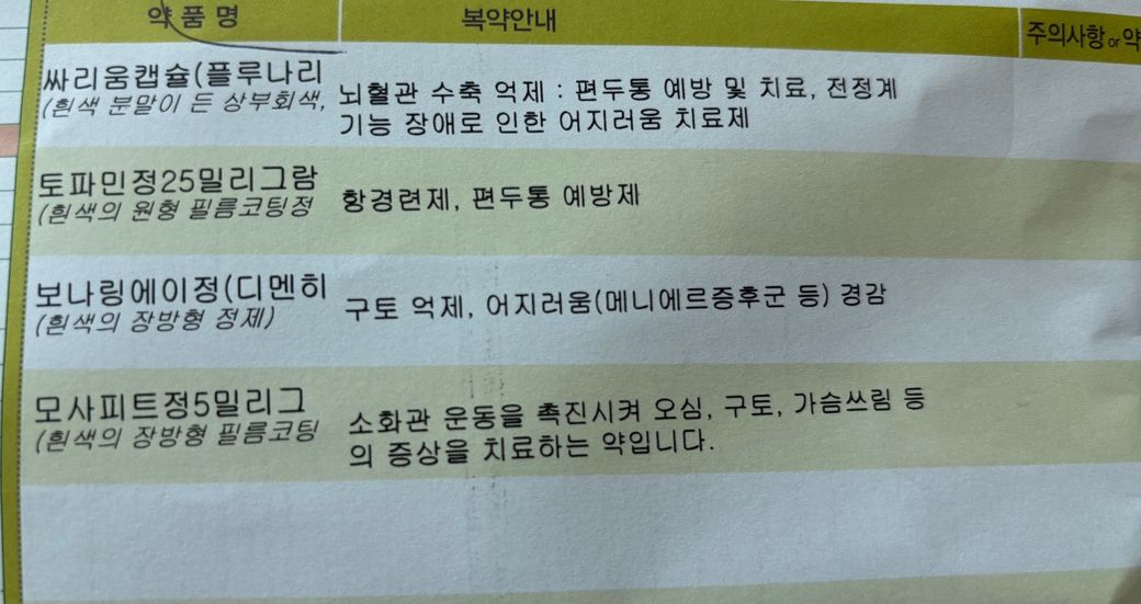 목 근육 쪽이 안 좋아서 정형외과에서 약을 복용하고 있는데, 이비인후과에서 편두통 증상으로 첨부된 사진과 같은 약들을 함께 복용하게 되었습니다.
