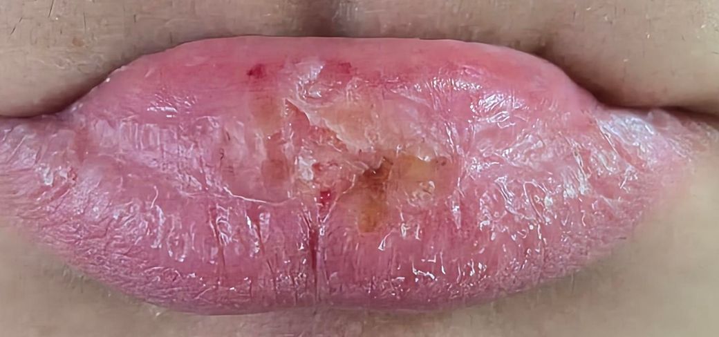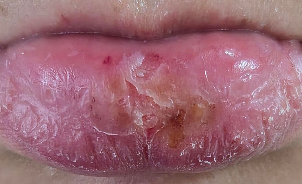 사진상 입술 중앙부에 미란(표피가 벗겨진 상태)과 황갈색 가피, 주변 홍반이 보입니다. 단순 건조보다는 자극성 접촉구순염(irritant contact cheilitis) 양상에 더 가깝고, 제품 성분에 의한 화학적 자극 또는 경미한 화상 형태로 해석됩니다. PDRN 자체보다는 플럼핑·토닝 계열에서 흔히 포함되는 향료, 멘톨, 캡사이신 유사 성분, 산성 성분 등이 원인이 되는 경우가 많습니다.