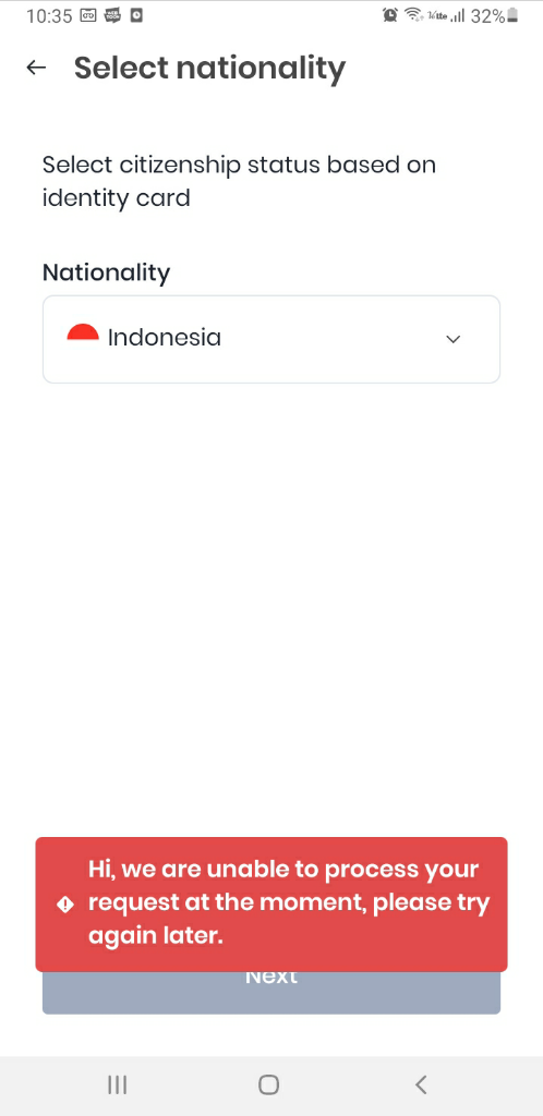 어느나라 국민인지 물어보는데 한국을 산택읗 하며누되지않을까요? 인도네시아를 선택하시려먄 일단 접속시 vtn을 이용해서 인도네시아 ip로 접속해보세요