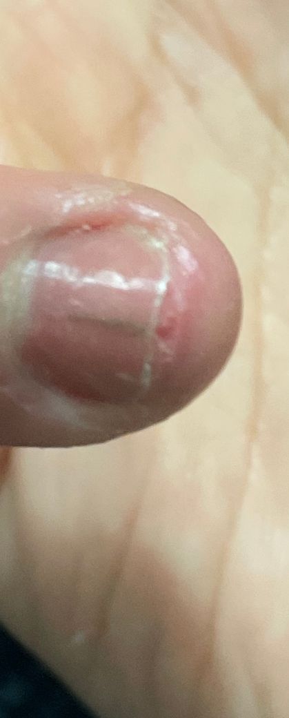 사진으로는 이물이박혔다가 빠진상황처럼 보입니다. 혹시 이물감이있다면 아니면 이물이 있다면 빼내야하겠지만 손톱이 들려있지않다면 제거가 쉽잖않아 인위적으로 손톱을 약간 들어 빼는방법이있습니다