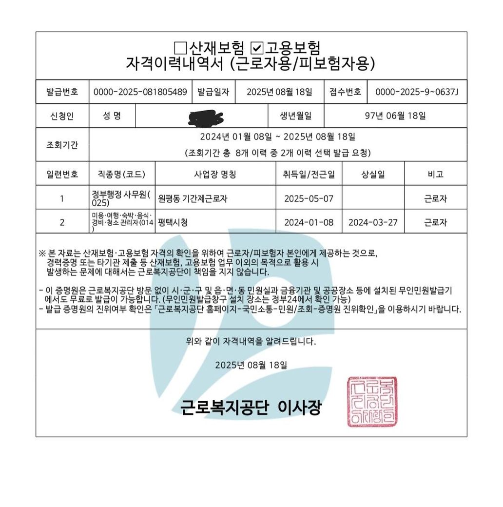 최종직장에서 2025.5.7 ~ 2025.8.20까지 재직하다 계약기간 만료로 이직할 경우 18개월 안은 2024.2.21 이후가 되므로 이전직장은 2024.2.21 ~ 2024.3.27 고용보험 가입기간 중 피보험 단위기간 일수만 합산할 수 있게 됩니다.