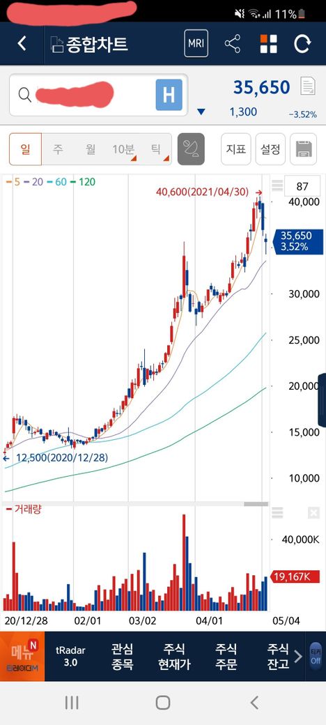 세번째가 60일선 맨아래가 120일선