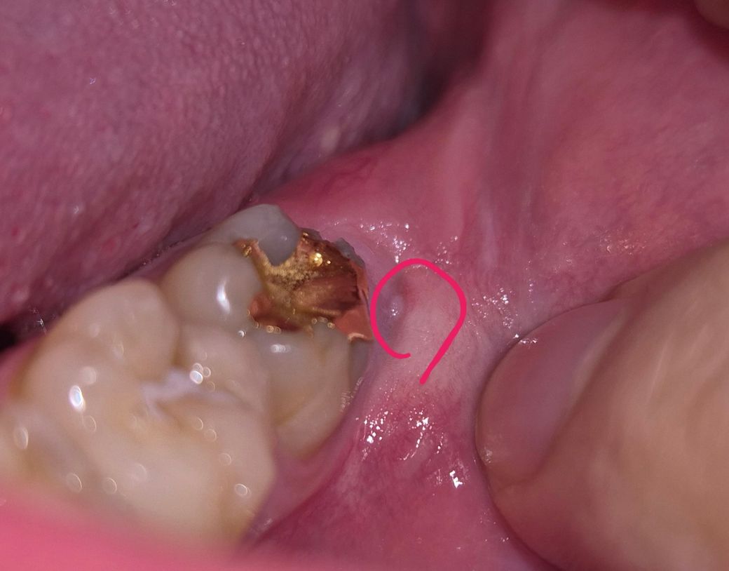x-ray에서 왼쪽 아래 사랑니가 있습니다. 이 사랑니 때문에 금으로 치료한 어금니 뒤쪽의 잇몸이 약간 염증을 일으킨 것입니다. 이런 경우 빨리 사랑니를 빼는 것이 좋습니다.