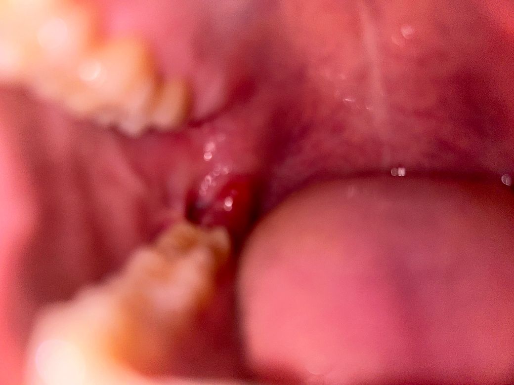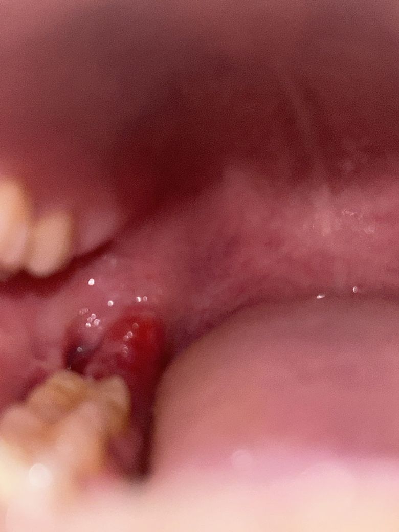 정확히 보이진 않으나 잇몸 부위 혈종이 아닐까 싶습니다.