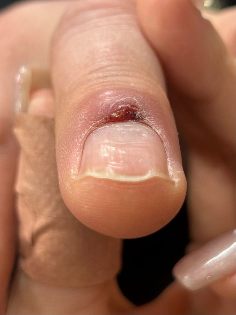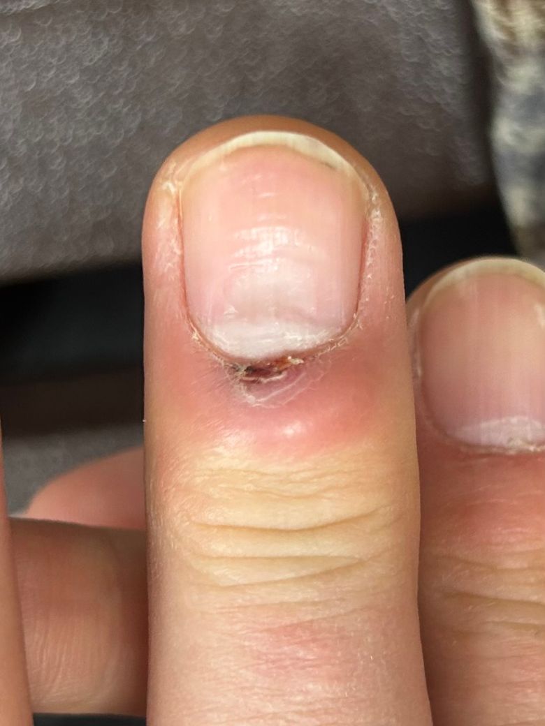 생긴 모양으로 보아서는 염증이 생기고 안에 농이나 딱지 등이 차 있을 법한 소견으로 보입니다. 관련하여서는 병원에 가서 치료를 받으시는 것이 적절해 보이며, 간다면 정형외과 또는 피부과 등 진료과가 적절하겠습니다.