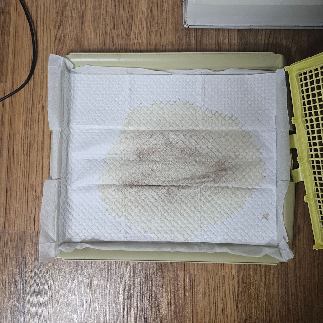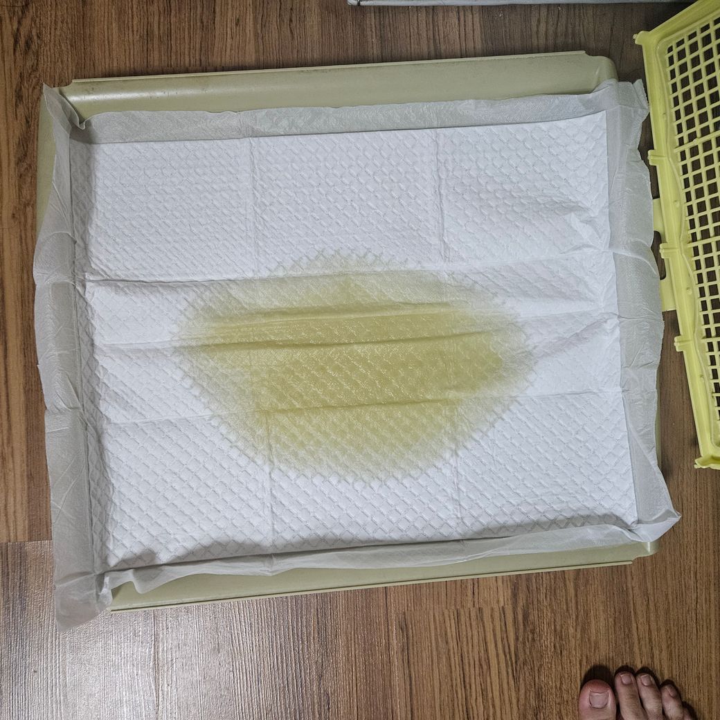 오전에 배변패드 갈아줄때는 노란색으로 멀쩡했는데 오후 10시 20분쯤 갈아주려고 보니 사진처럼 갈색빛이 띄더라구요.
