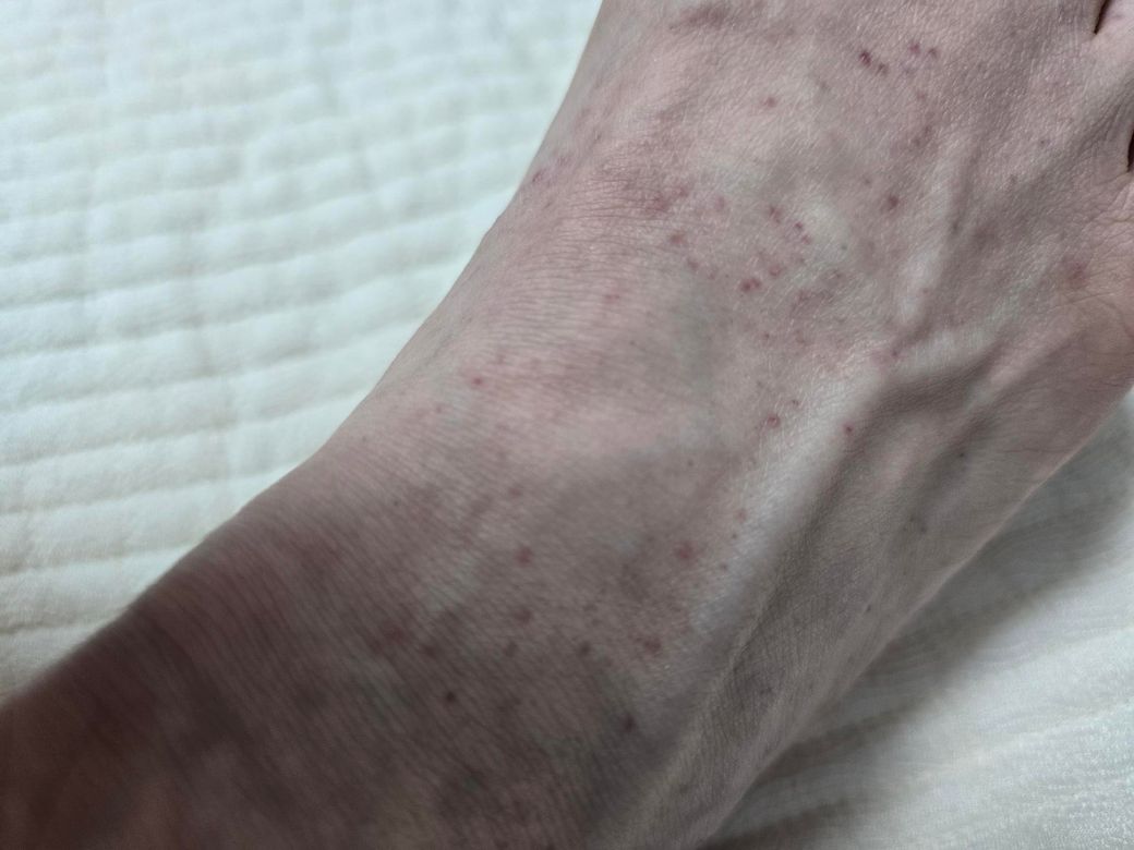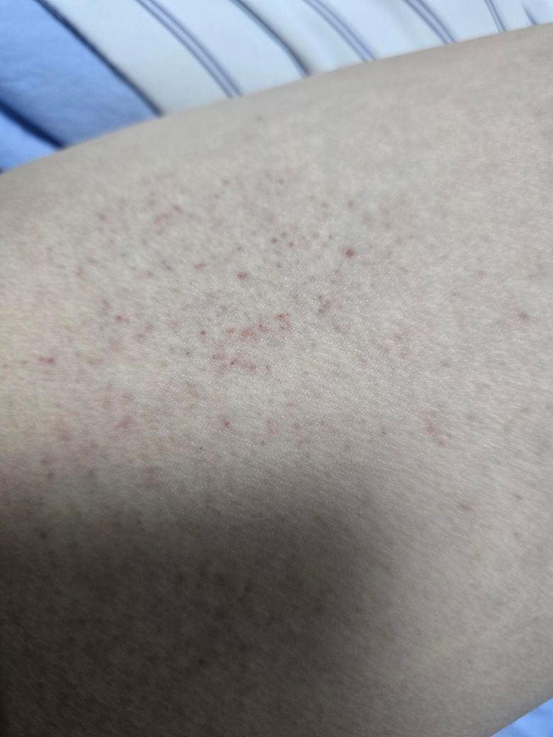 밑에 사진처럼 보이는 빨간점들이 발등, 오른쪽 허벅지 왼쪽, 왼쪽 목 근처, 양 팔뚝, 허리띠 주변 등에 나타났습니다.