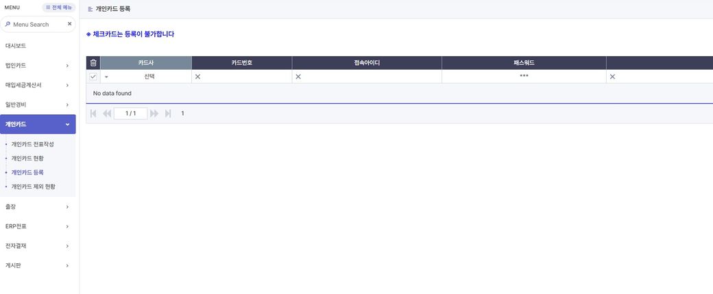 목적은 업무 시 식대나, 출장교통비 같은 공적인 업무를 개인 카드로 먼저 쓰고, 영수증을 제출하여 결제를 맡아 추후 돈으로 받는 시스템이었는데, 이번에 종이영수증을 없앤다는 면목하에 개인이 쓰는 카드 ID / PW를 시스템에 등록하여 승인 내역을 모두 긁어와서 보여주고 그것들 중 회사 업무에 사용한 정보만 추려서 결제를 맡는 시스템으로 하는 형태로 이번에 만들려고 하고 있기 때문에 개인의 ID / PW를 입력하도록 되어 있습니다.