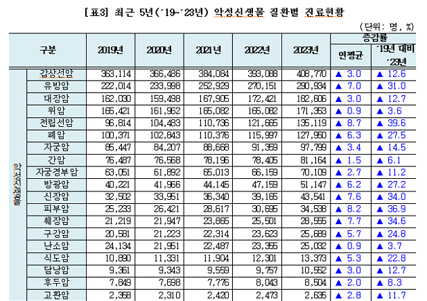 2023년 암발생률에서 대장암의 순위를 확인을 해보시고 그 보다 흔한 암종이