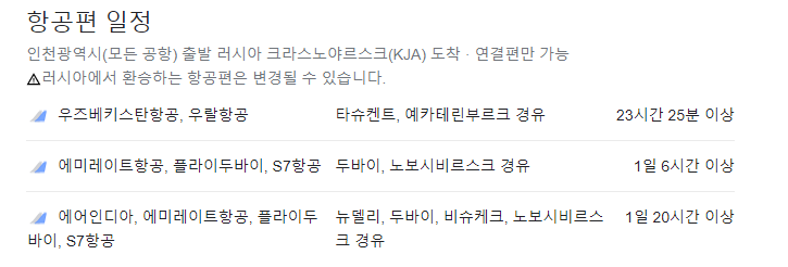 블라디보스톡 항공권도 거의 매일 있었지만 현재는 우즈벡까지 경유해서 가야하는 상황입니다.