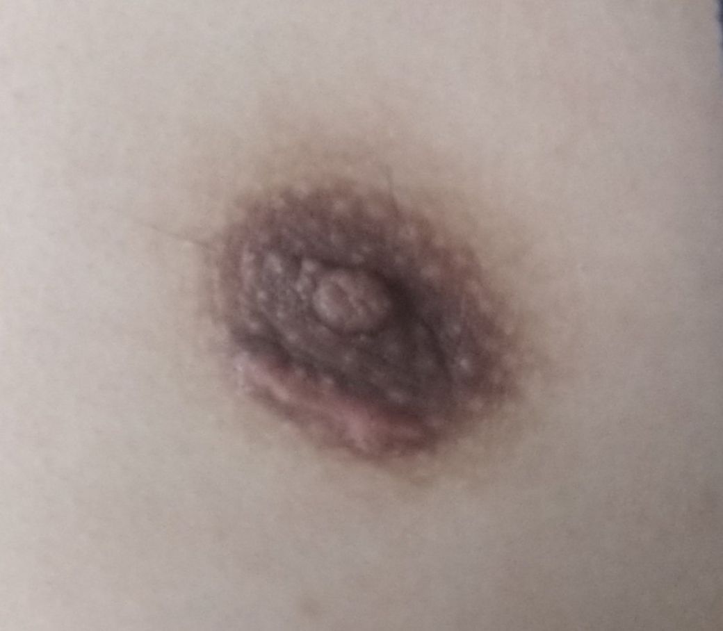 사진의 소견을 통해 보았을 때에는 유륜 부위의 켈로이드가 의심되는 소견이 있습니다. 가만히 경과를 지켜본다고 사라지지 않을 가능성이 매우 높아 보입니다. 관련하여 제거를 위해서는 피부과 또는 성형외과에서 제거 시술을 받으실 필요가 있어 보입니다.