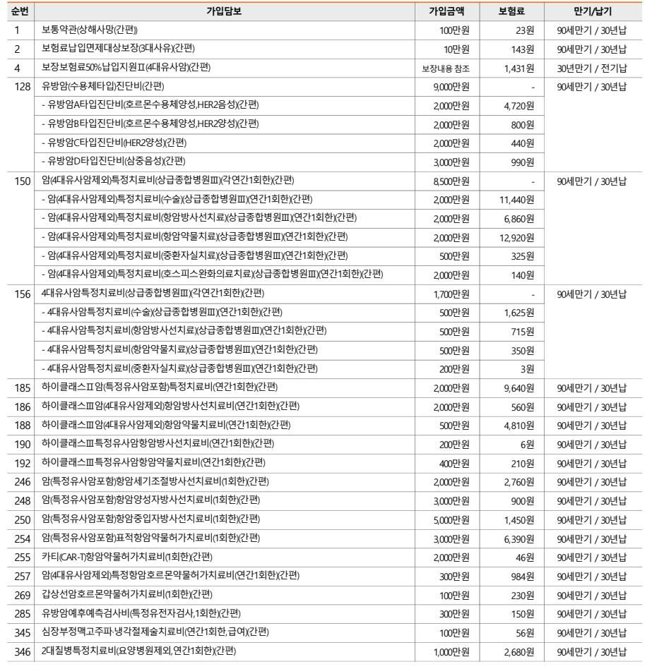 암보험 가입하려고하는데 아래 보장내역중 꼭 필요한 가성비좋은 보장 추천부탁드립니다. 3만원 이내로 유방암관련, 비급여보장, 매년 보장받을 수있는(암치료후 다음년도에 재발해도 다시보장받는) 보장내역 이름 추천부탁드립니다.