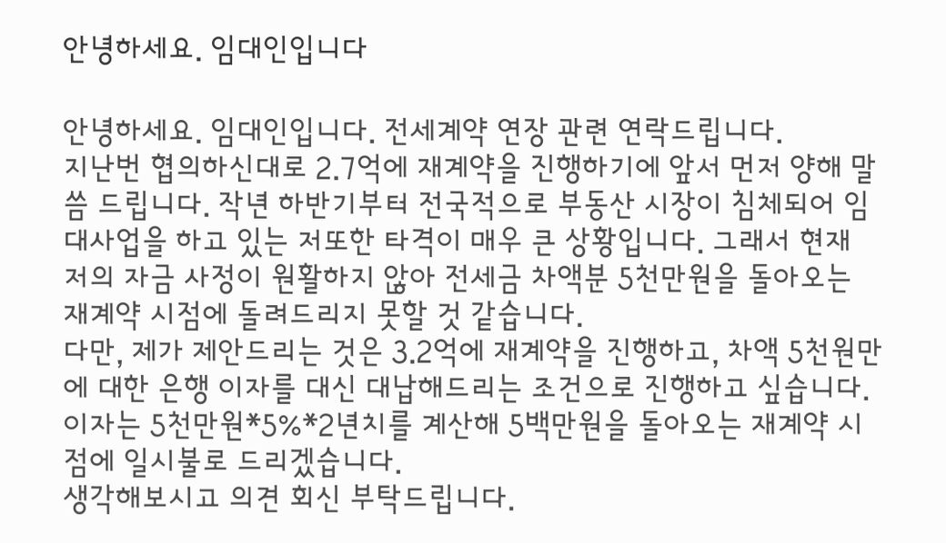 안녕하세요. 전세세입자이고 7월에 연장계약을 앞두고 있습니다. 현재 3억 2천에 전세를 살고있는데 전세가격이 많이 떨어져서 집주인과 문자로 2억 7천에 재계약하기로 논의를 마쳤습니다. 재계약 방법 등 확인하고 연락준다길래 기다리고 있었는데 오늘 갑자기 본인이 사정이 어려워 전세차액 5천만원을 돌려줄수가 없다며, 3억 2천에 재계약을 하고 차액 5천만원에 대한 2년 이자 500만원을 선지불해주겠다고 합니다. 제가 봤을땐 여러모로 이상한 제안같은데 받아들여조 될까요? 문제되는점이나 추가로 논의해야할 점 있을지 문의드립니다. 임대인에게 온 문자 첨부합니다.