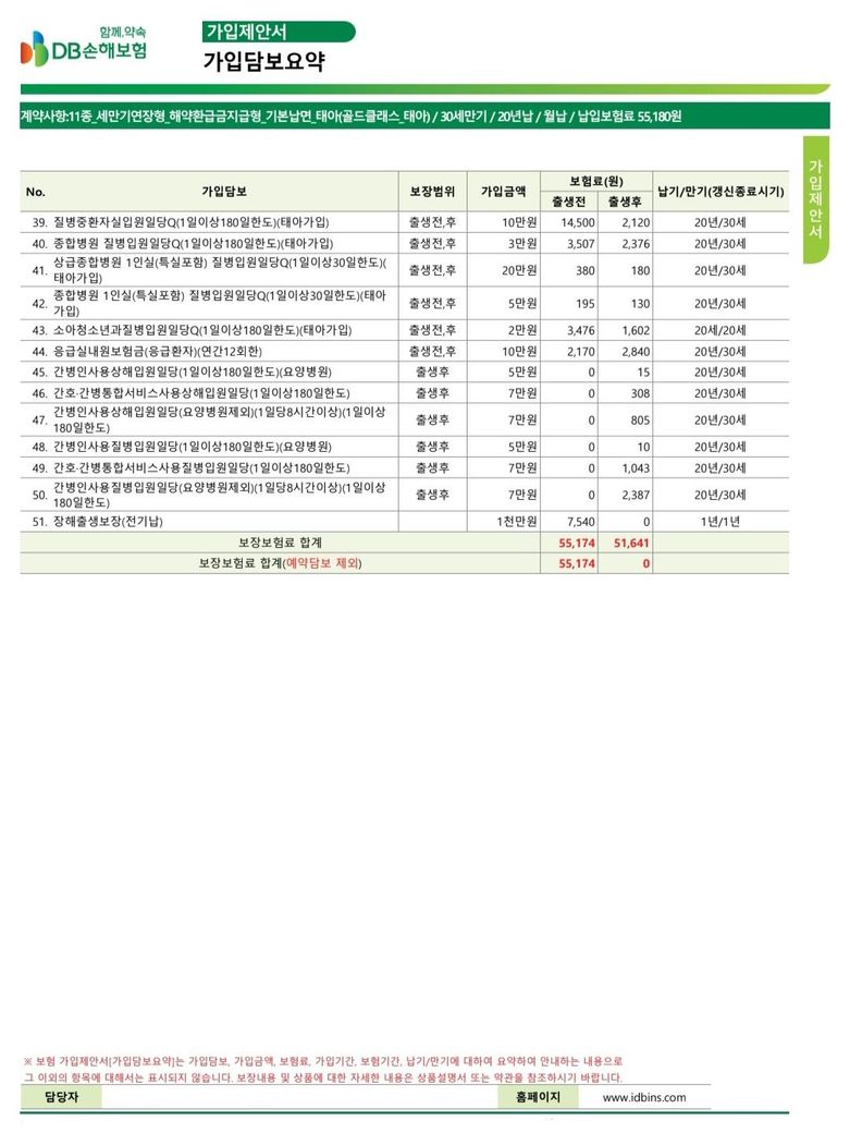 디비손해보험 상품으로 제안서를 받으셨네요. 태아는 H해상 상품으로 보편적으로 많이 가입합니다. 태아나 신생아 때 발생 가능성이 있는 질병들에 대한 보장이 디비는 좀 약해 보이네요. H 해상 상품도 검토해 보세요.