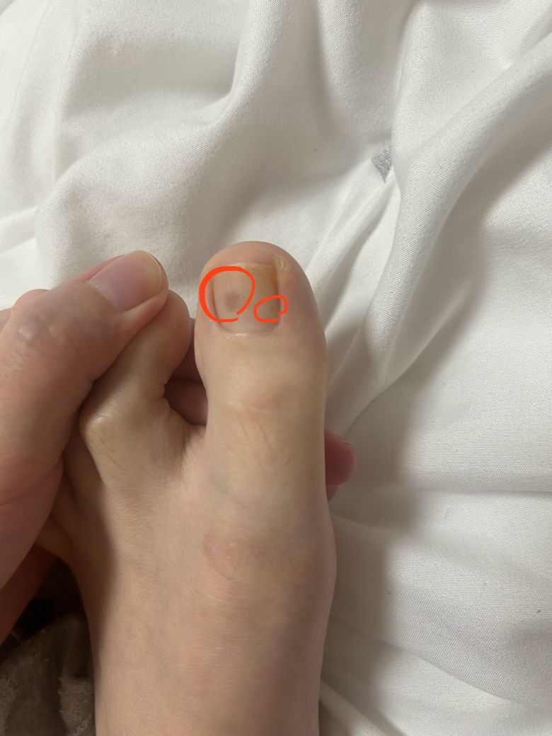 사진과 같이 왼쪽 발의 엄지발톱에 연한 갈색의 무언가가 생겼습니다. 멍들만한 일은 없었던 것 같은데..