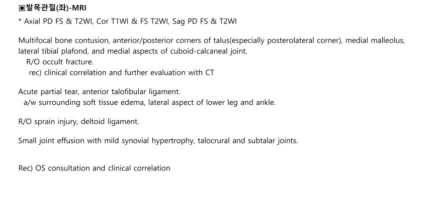 발목 인대 파열로 mri를 찍게 되었는데, 판독지가 의료 전문 용어가 많아 전혀 해석이 되지를 않네요 ㅠㅠ 학생이라 병원을 여러 군데 가지 못해 여기서라도 자문을 구해봅니다 !! 혹시 결과가 무엇인지 꼭 좀 도와주실 수 있으실까요 ? 🥺