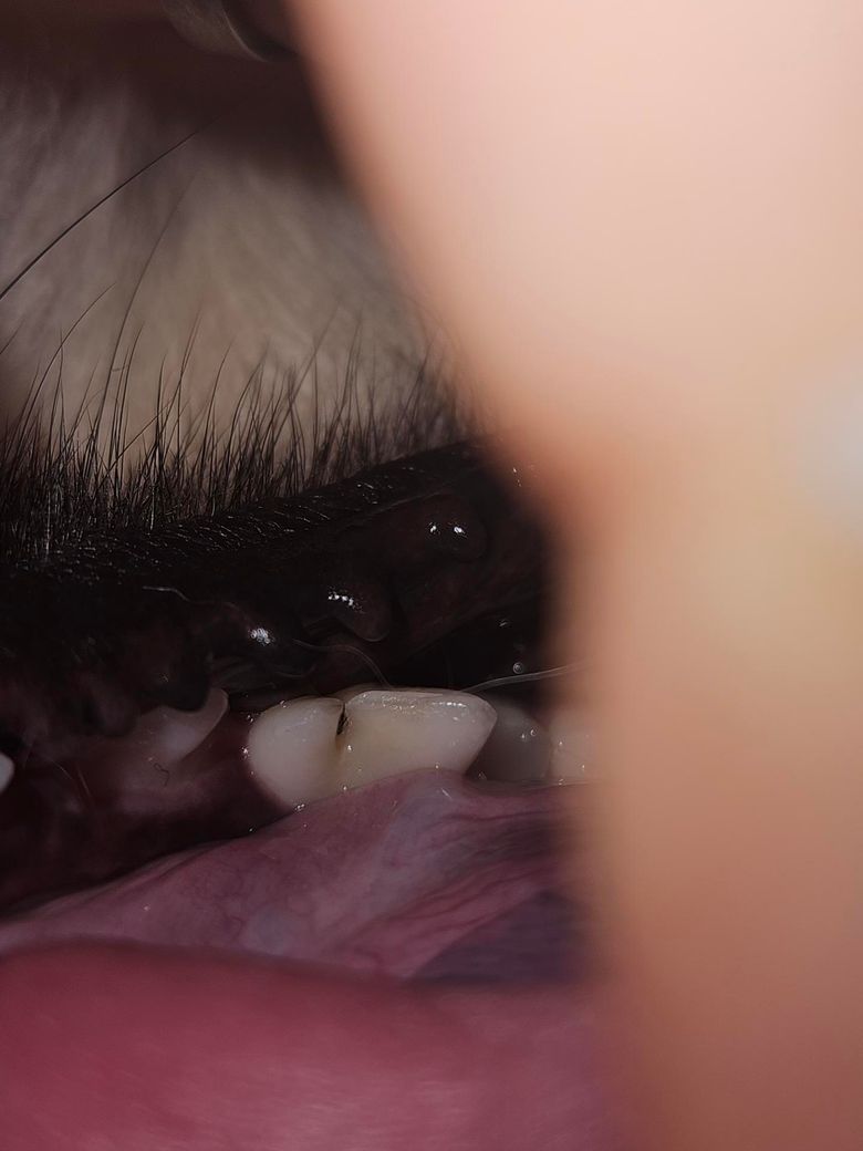 사진만으로 단정할 수는 없지만, 강아지 치아 옆면에 보이는 검은 선은 사람처럼 흔한 충치라기보다 착색, 치태, 치석, 표면 손상일 가능성을 먼저 생각하게 됩니다. 말씀하신 것처럼 강아지는 사람보다 충치가 흔한 편은 아니지만 아예 안 생기는 것은 아니어서, 선이 점점 진해지거나 패인 느낌이 있거나 입냄새, 잇몸 붉어짐, 통증 반응이 있으면 병원에서 확인해 보시는 것이 좋습니다. 특히 사진처럼 한 군데만 보인다면 단순 착색일 수도 있지만, 실제로는 확대해서 보고 치과 기구로 만져봐야 구분이 됩니다. 지금처럼 치약으로 관리해 주는 것은 도움이 되지만, 가능하면 거즈나 손가락 칫솔로라도 치아 표면을 직접 닦아주는 쪽이 더 효과적입니다.