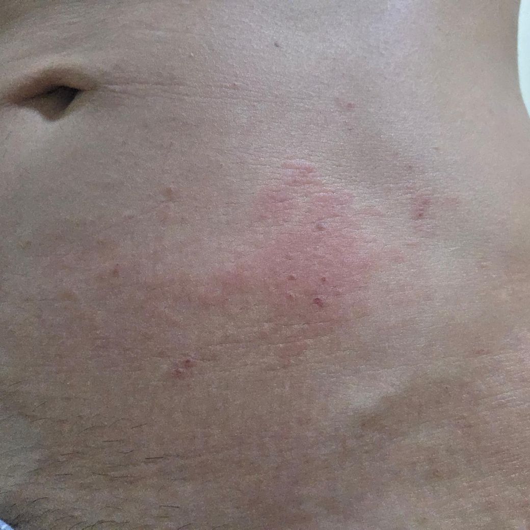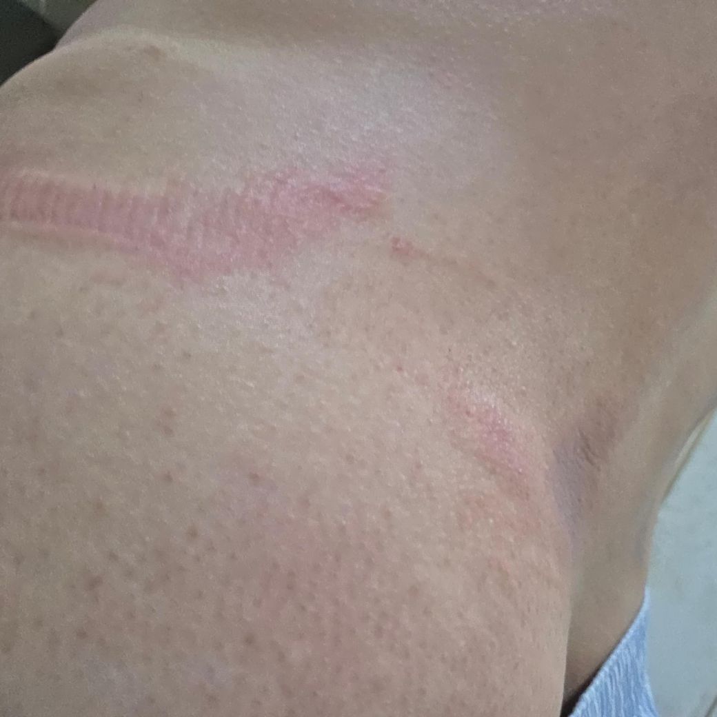 사진 소견과 경과를 종합하면 전형적인 대상포진 양상으로 보이지는 않습니다. 대상포진은 보통 한쪽 피부절(dermatome)을 따라 “띠 모양”으로 군집된 수포(물집)가 생기고, 발진 전에 신경통 양상의 통증이 먼저 나타나는 경우가 많습니다. 현재 사진은 뚜렷한 수포보다는 홍반성 반점과 긁힌 자국, 선형 자극 흔적이 혼재되어 있고, 분절을 따라 일정하게 배열된 형태는 아닙니다.