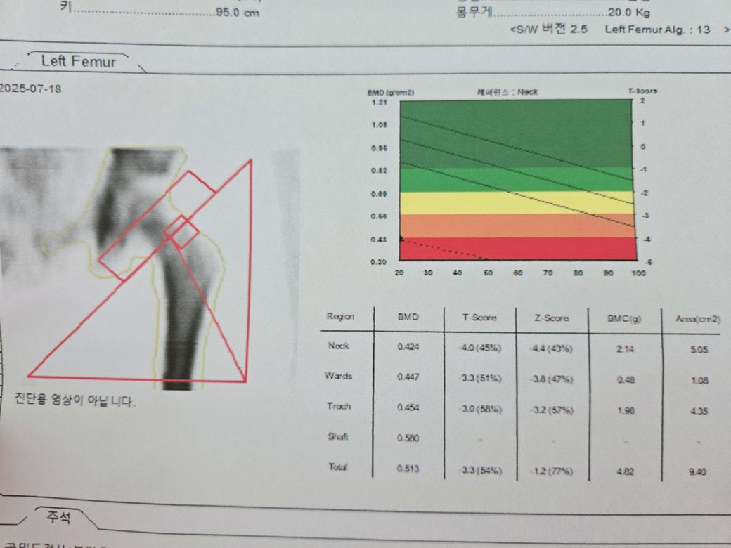 골밀도 검사는 일반적으로 T -score 와 z-score를 통해 골다공증 위험도를 평가합니다. 20키로로 입력된 값은 표준 데이터 대비 왜곡이 있을 수 있어 결과 해석이 부정확할 수 있습니다.