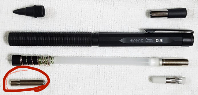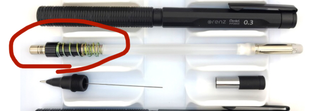 Q1) 제가 샤프를 분해하면서 저 빨간 동그라미 친부분(척 내부 지지대라고 불리는 것)을 만졌는데 검은 가루와 함께 기름기(?) 같은 것이 나왔는데 뭔가요? (저 부분은 샤프심이 지나다니는 곳임) 샤프심 때문에 묻어나오는것일까요? 아니면 원래 칠해져있던 기름 같은 건가요?