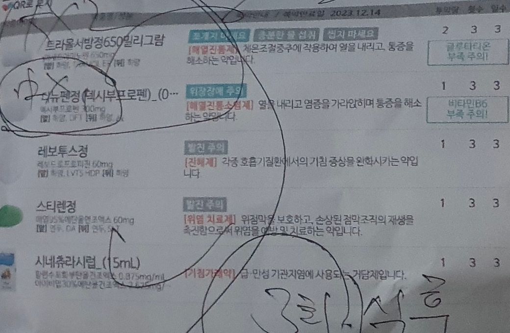우선은 디뉴펜정을 제외하고 약을 복용해보신 후 괜찮은지 확인해보시고, 괜찮아지실 경우 해당 약을 제외하고 약을 복용하시며 괜찮아지지 않을 경우 병원에 재차 방문하여 관련내용으로 상담을 하는 것이 좋겠습니다.