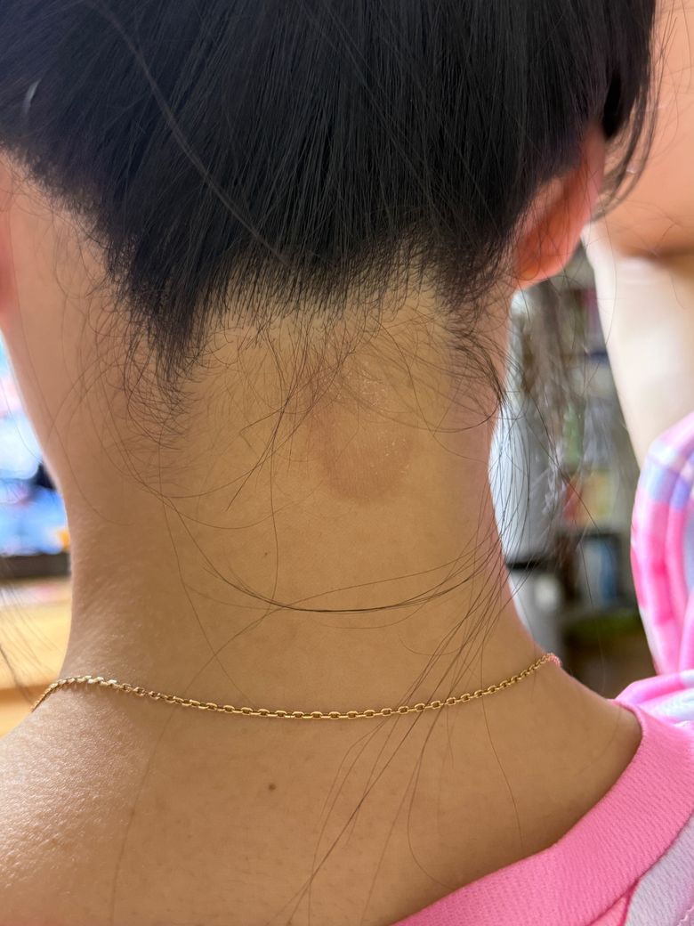 뒷목이나 머리가 맞닿는 곳은 무의식적으로 긁거나 문지르기 쉬운 부위로 자각하지 못하는 사이에 오랜 기간 자극이 반복되면 피부가 두꺼워지거나, 마찰에 의한 색소 침착으로 사진과 같은 형태가 나타날 수 있습니다.
