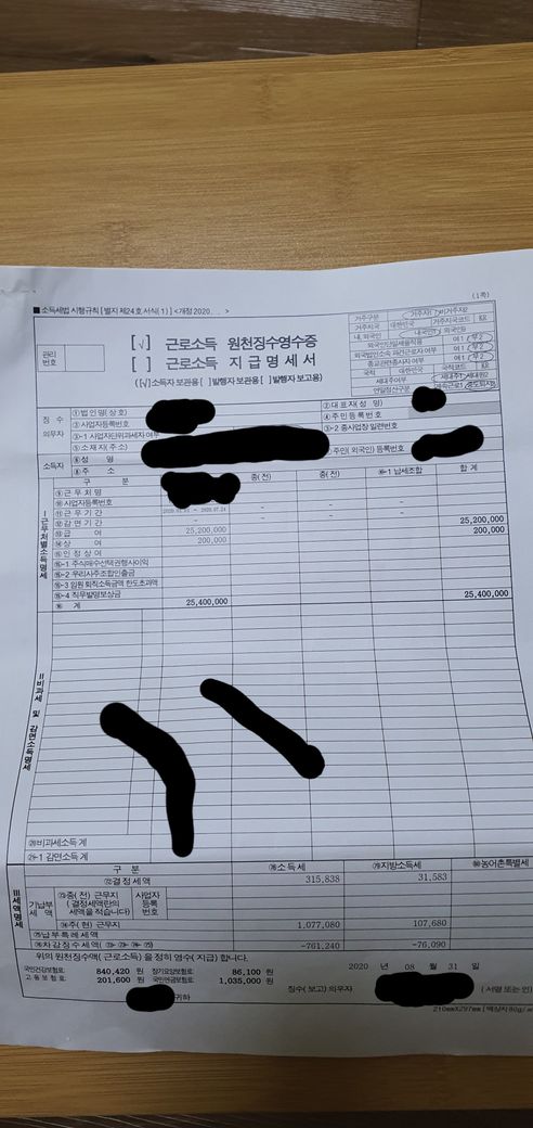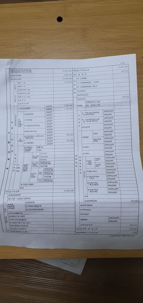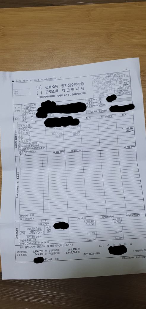 연말정산 서류를 받았는데 제가 정확하게 받을 금액이 얼마인지 저게 맞게 신고가 된건지 봐주세요ㅠ 처음 세장이 전 근무지이고 나중 세장이 현근무지입니다.