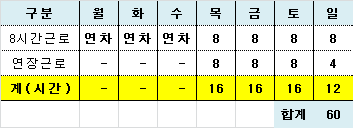 1) 총 근로시간으로 60시간으로 아래의 표처럼 그 이상을 초과하지 않으면 위법하지 않다.