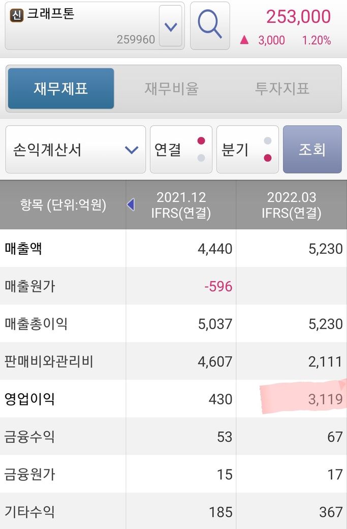 크래프톤 22년 1분기 영업이익은 3119억 정도로 나왔는데요.