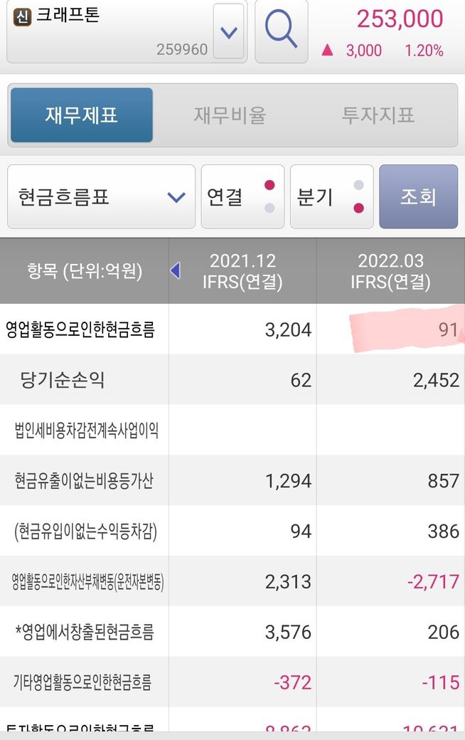 그런데 22년 1분기 영업활동현금흐름이 91억 밖에 되지 않습니다.