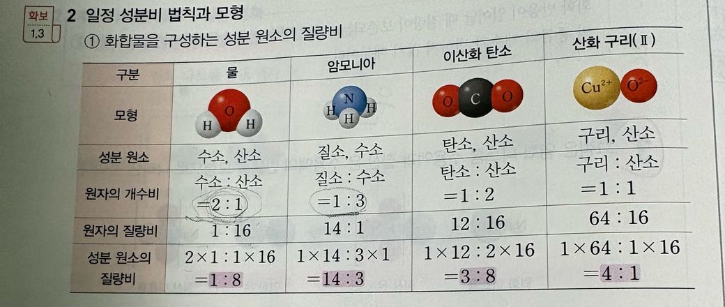 중3 과학 일정 성분비 법칙 설명 부탁드려요ㅠ
