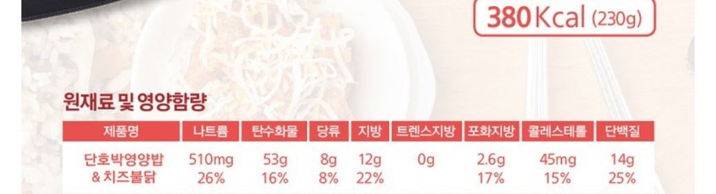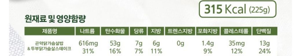 칼로리: 315~435kcal(성인 남성 기준 부족)